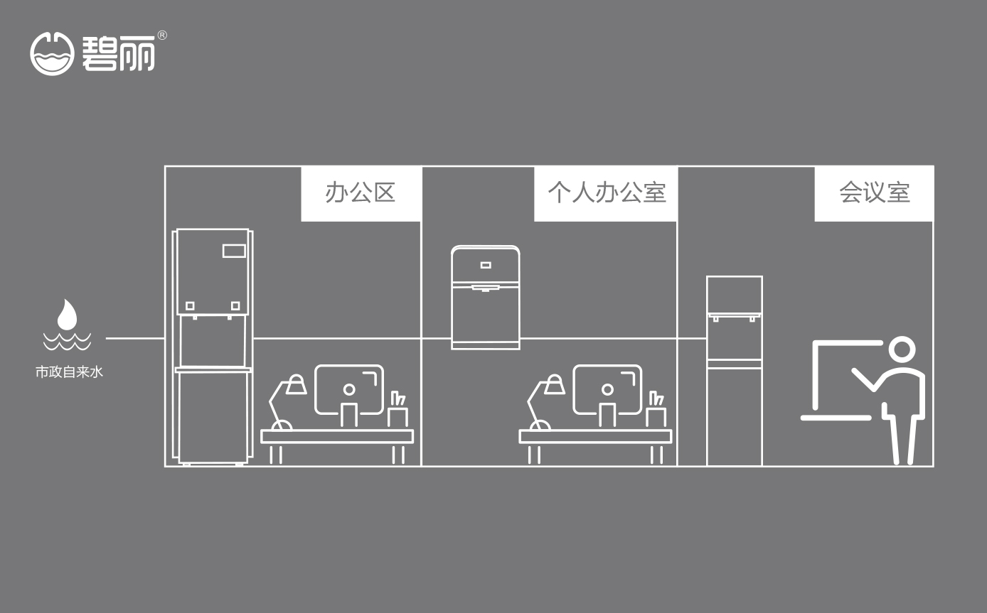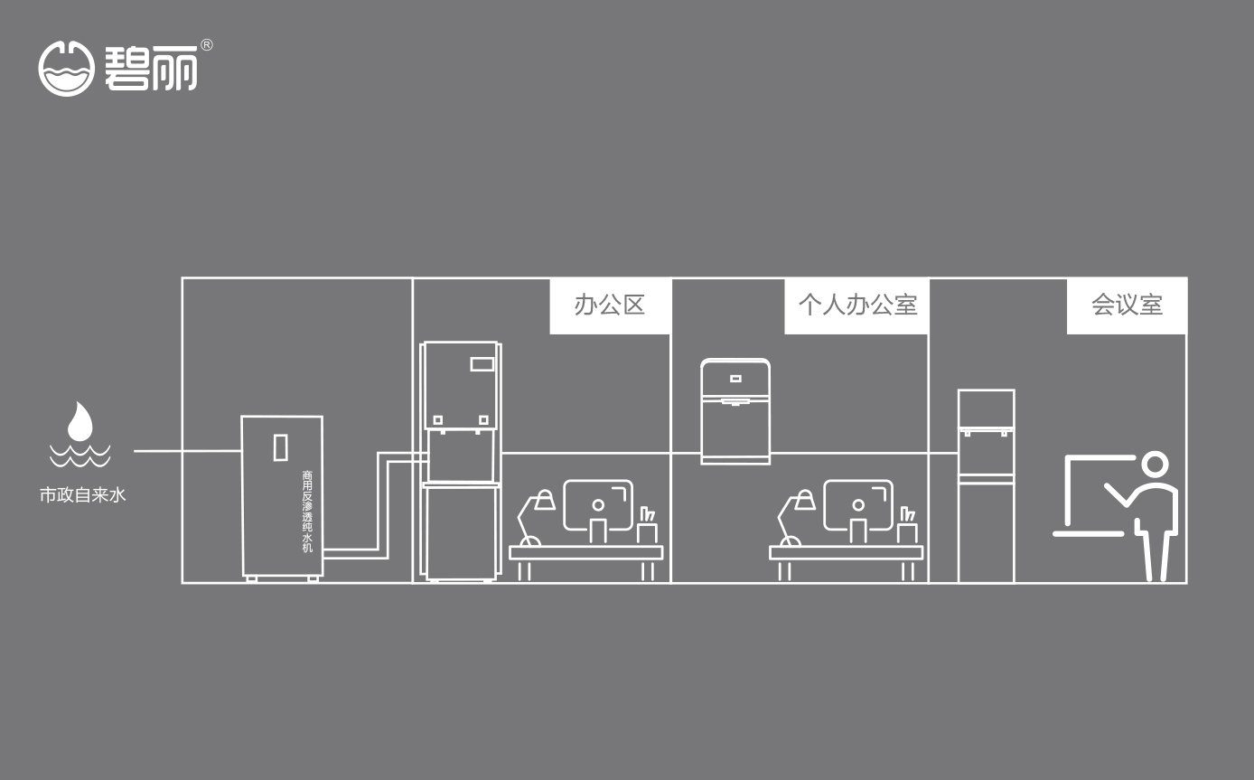 碧麗租賃商用反滲透純水機(jī)將自來水集中處理后,把優(yōu)質(zhì)的純凈水通過專用的供水管道輸送到各飲水點;